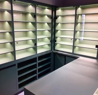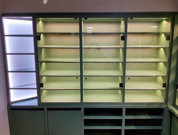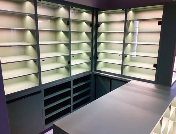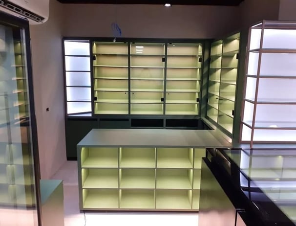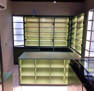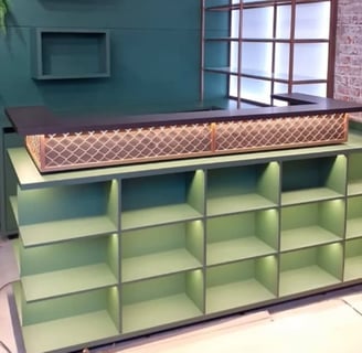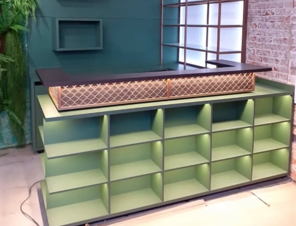Balcão caixa com serralheria e nichos iluminados