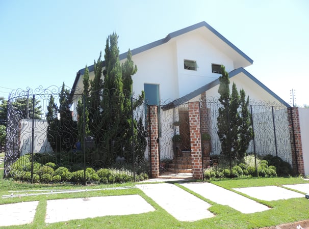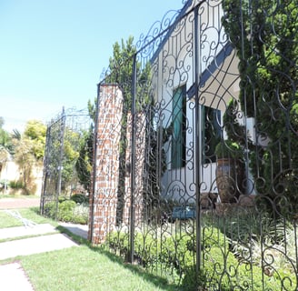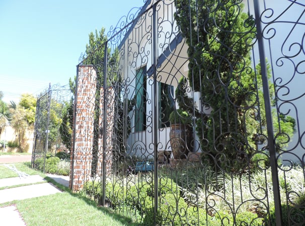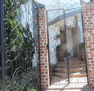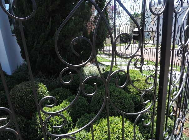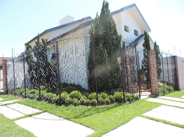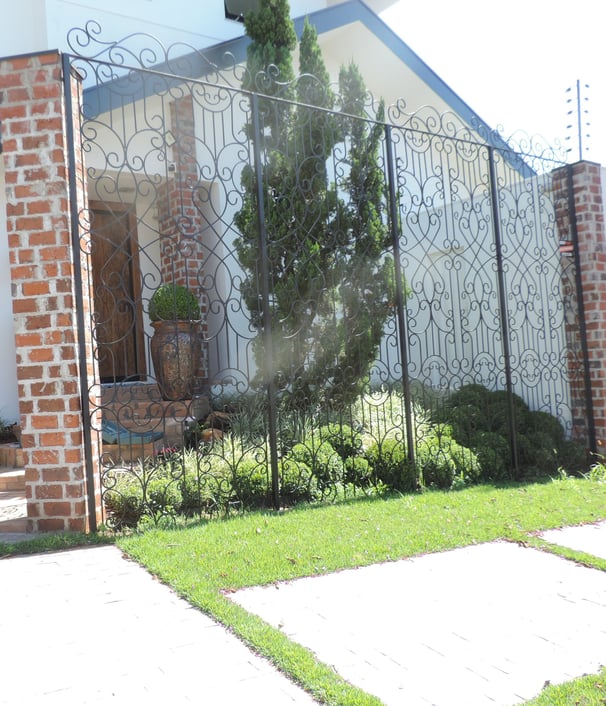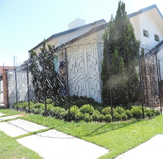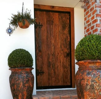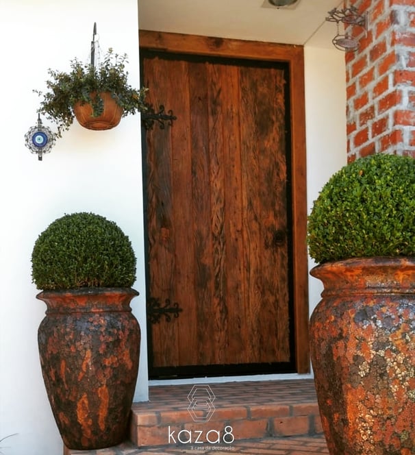 Porta de madeira com moldura metálica e dobradiça trabalhada